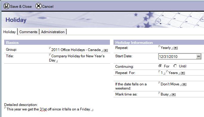 - There are already national holidays listed, but leave those alone. Those are the official holidays which may not correspond exactly with the days your company takes off. Instead, create a new set of holidays. When you do this, put them into a group named appropriately, for example “2011 Office Holidays – Canada”. I like to put the year first so it is easier to find in the list.