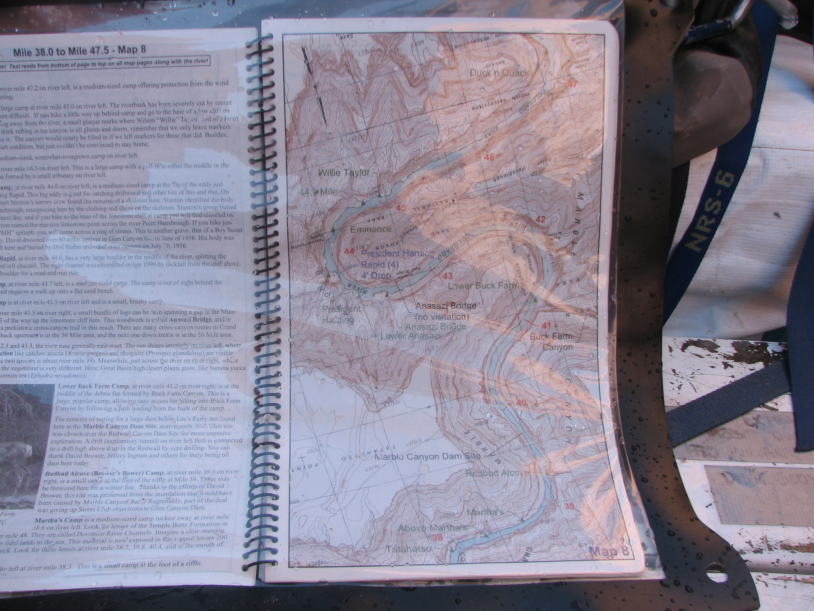 TRIP TIP: NRS makes a map case specifically designed to fit the Grand Canyon river map book. While the map book is made of waterproof paper, the pages hold the water long after it gets wet (mine was still wet and sandy when I got home from the trip a week later.) The case would also be good for charging a solar charger while on the river during the day.