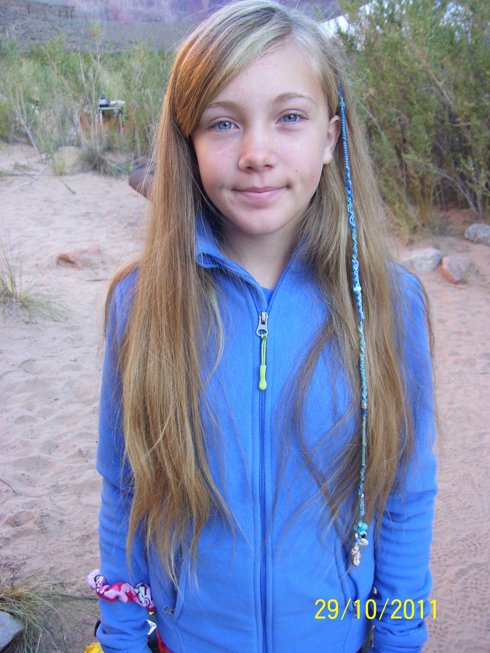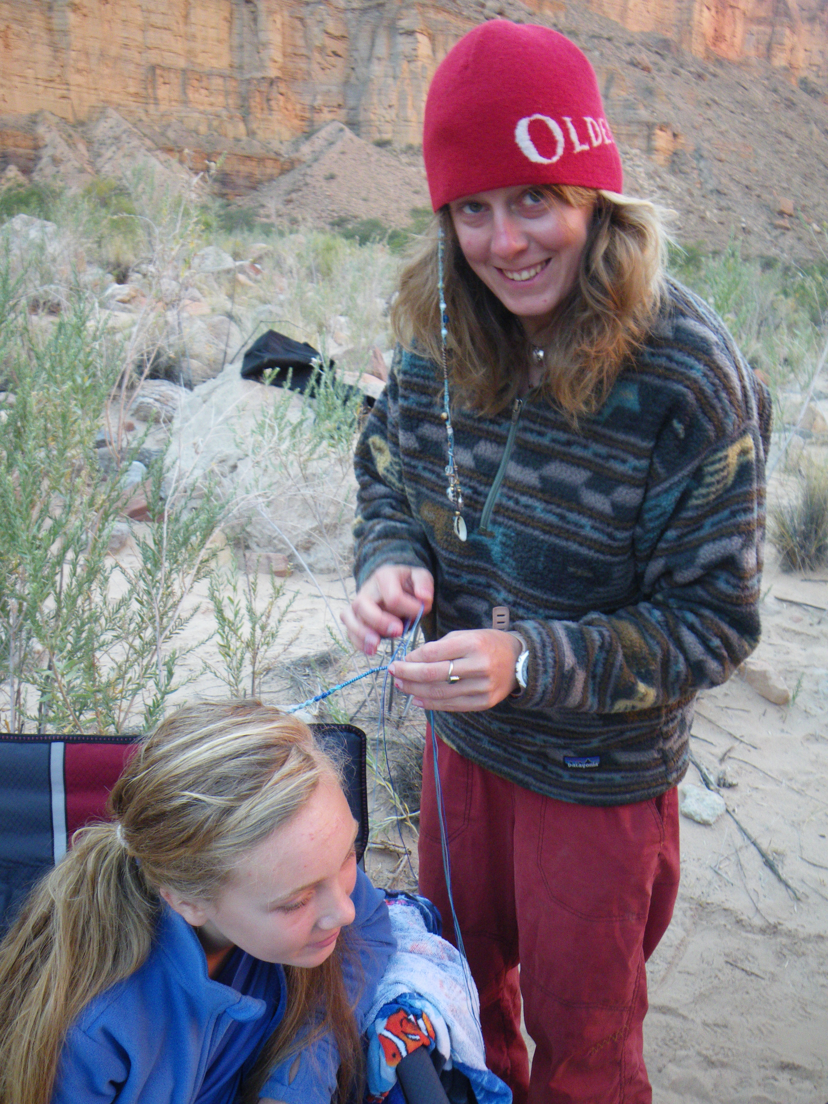 This was our hottest day yet. The temperature reached 85 degrees and lots of sunshine at this camp. That, combined with the unusually warm river (57degrees instead of the normal 45) made bathing as good as you’ll get in the Canyon. First the ladies had the beach, then the guys took their turn. Ariel came back for the royal spa treatment to get her hair washed. She is having so much fun! Missing 2 weeks of school for this? Oh Yeah! Later on Natalia braided a string of beads into her hair. [This would prove to be her favorite part of the trip and the beads are still in her hair 2 months later.] It’s good to see her getting along with all the women so well. I can see her maturing before my eyes. [Note to fathers: An adventure like this is an incredible bonding experience. Do not let any excuses stop you from making your own father-daughter adventures like this. To experience a river trip in The Canyon is life-changing. To share the experience with your daughter is sublime.]