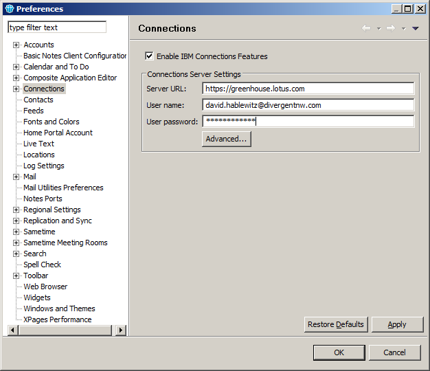 15. Fill in the info for your Connections server. If you want to test it out on Greenhouse to see everything it can do, enter the server URL of https://greenhouse.lotus.com and use your username and password for your Greenhouse account. (You should have had to create one before you could download the plug-in. Don’t have one? Go back to that browser window where you downloaded the plug-in and click Sign Up in the top right corner.)